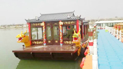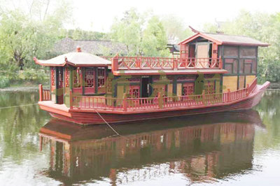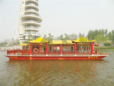 畫舫船就是裝飾古典華麗的游船,是"中國風"的仿古游船,結合古典園林建筑,體現了中華文明的古典藝術.畫舫船豪華而又古典,船上的建筑按照中國古代建筑里的亭臺樓閣,建筑工藝之復雜,要求之嚴格,仿古畫舫游船的特點飛檐翹角、玲瓏精致的四角亭子逐漸成形,赫然立于船頭,美人靠、盤龍柱子、彩畫……龍柱上的浮雕盤龍和祥云一層扣著一層,層層錯落有致,雕刻精細到盤龍身上的每一個鱗片都細細可數,古代皇家標志性元素,在畫舫船上體現的淋漓盡致。除了雕刻、花窗,整條船還有一個看點,那就是弧線優(yōu)美、高高翹起的船尾。游船并不大,長約10米、寬3米,但是整體看起來堪稱一件藝術品。船尾的雕花欄桿與船艙、船頭的雕刻遙相呼應,船身四周貼著浮雕祥云,給整條船增添了富貴、華麗的氣質。